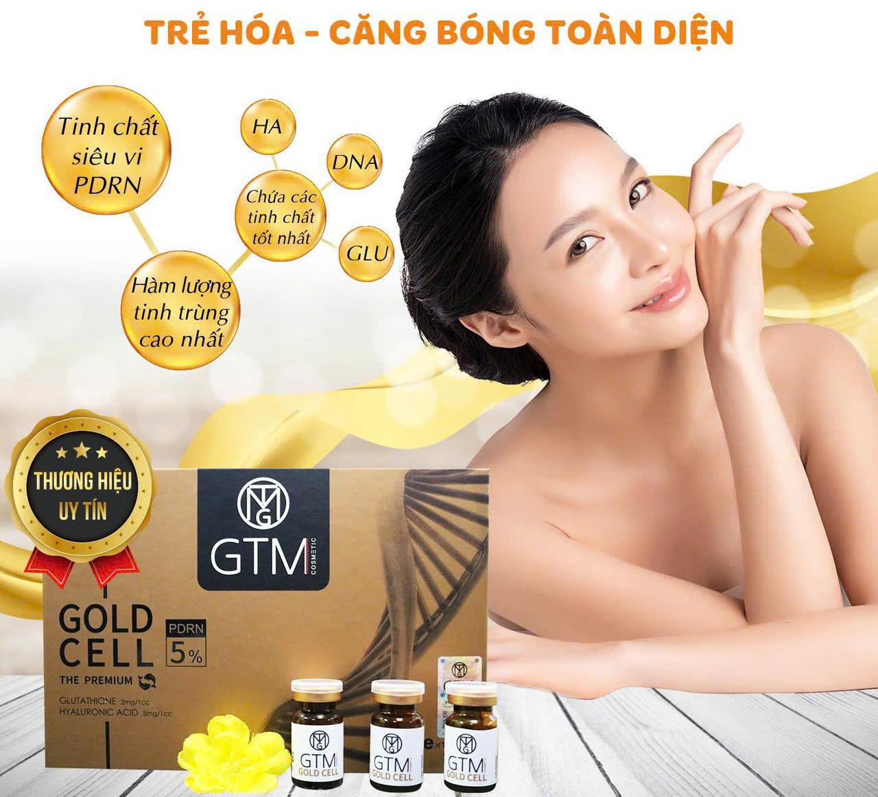 DQ Gold Cell Advantage: Thủ thuật tái sinh tế bào-Bí quyết trẻ hoá (10 tuổi) làn da, ứng dụng công nghệ độc quyền PDRN(Poly Deoxy Ribo Nucleotide) và acid Hyauronic Acid giúp sản sinh, thúc đẩy các nhân tố tăng trưởng từ DNA, thúc đẩy sự tăng trưởng tế bào da, sản sinh collagen giúp cải thiện làn da, ức chế quá trình sản sinh sắc tố gây ,